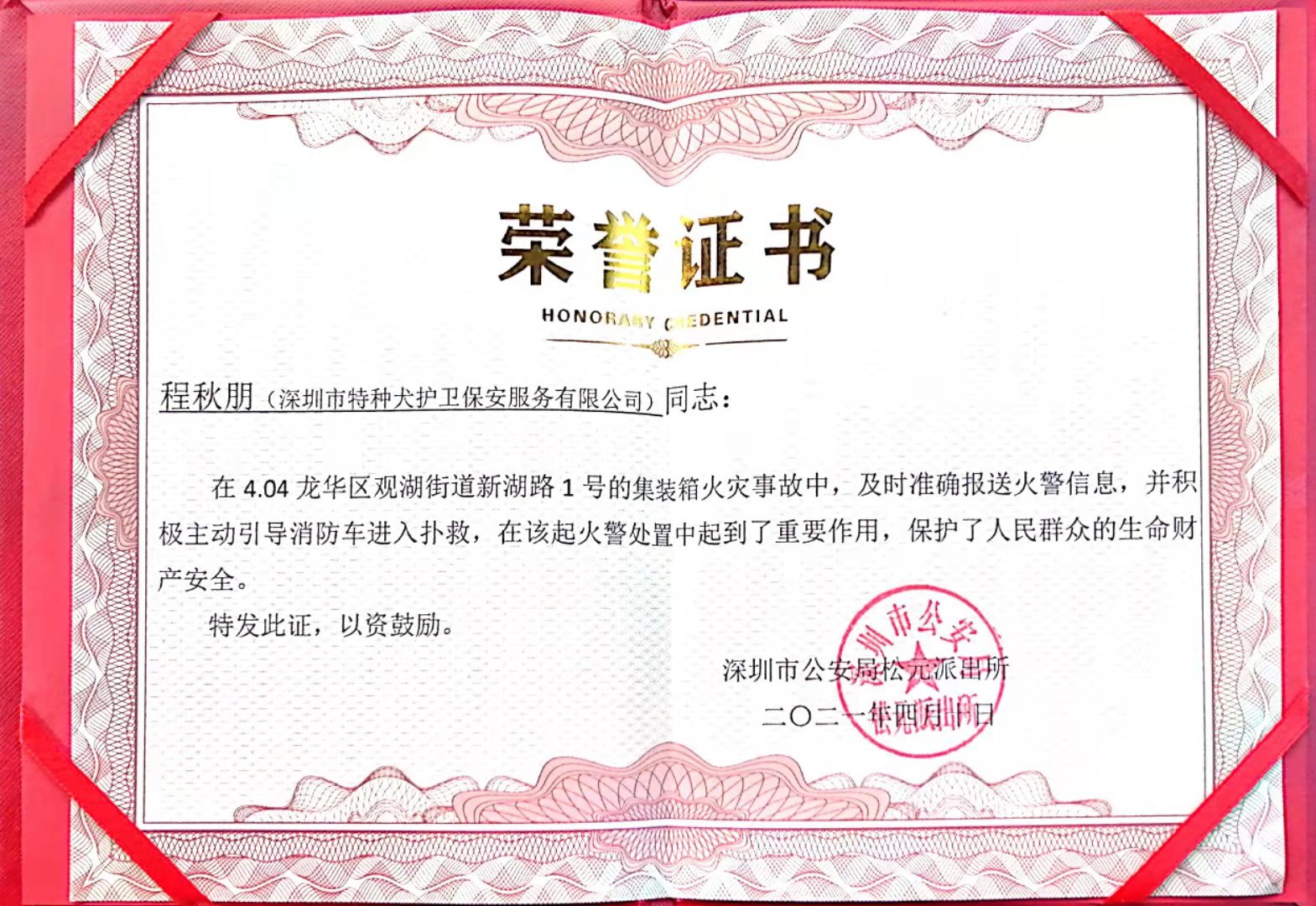 2021年4月4日晚上10点30分左右,我公司犬防基地队员刘锋、程秋朋两名同志,在外出归队途中,发现基地旁边一工厂发生火灾,现场情况比较紧急,该两名队员第一时间过去帮忙参与灭火。起火位置位于工厂集装箱房,由于火势较大,普通灭火器材不能扑灭,工厂只有一名年长的值班人员,对消防器材不够熟悉,队员当即拨打119火警电话并告知消防队准确的起火位置和火势情况,然后跑到事发工厂外主干道引导消防车进入火灾现场,为灭火处置争取到了宝贵时间。等到消防队赶到现场之后,该两名队员积极配合消防队及时扑灭了火灾,挽回了人民群众的生命和财产安全。
